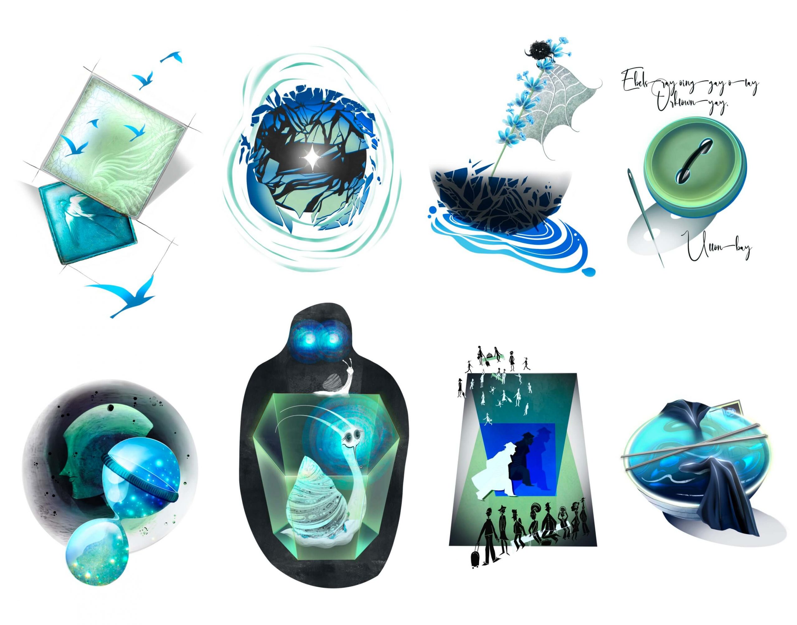 A set of abstract illustrations and book cover artwork for Human Threads, a book of contemporary novels and poems by Daniel Friedland